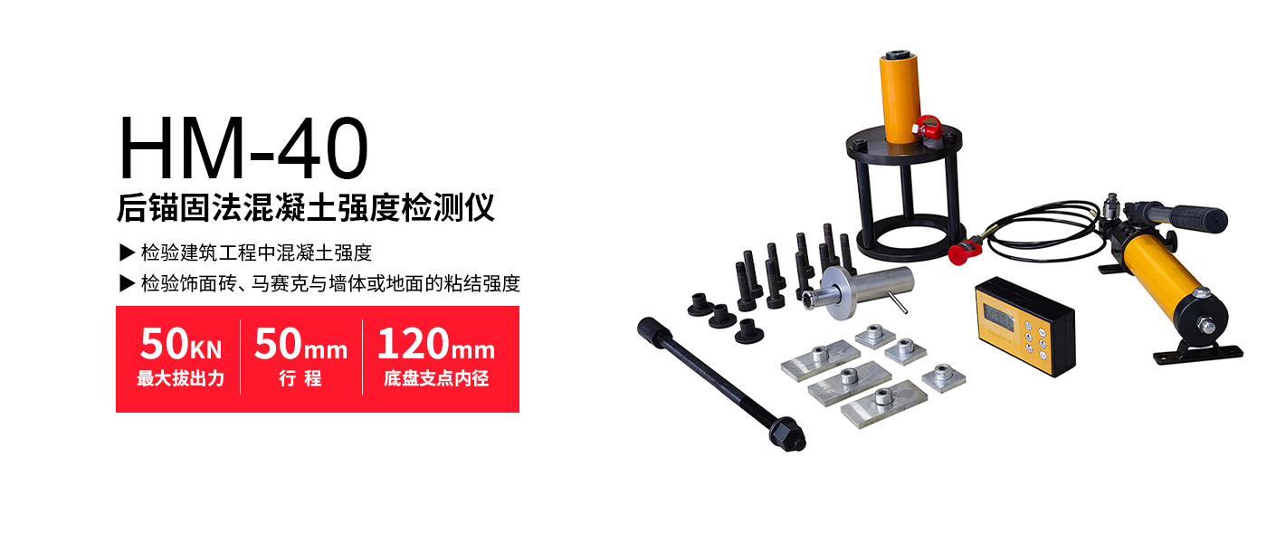 HM-40型后錨固法混凝土強度檢測儀用于檢驗建筑工程中混凝土強度及飾面磚、馬賽克與墻體或地面的粘結強度。